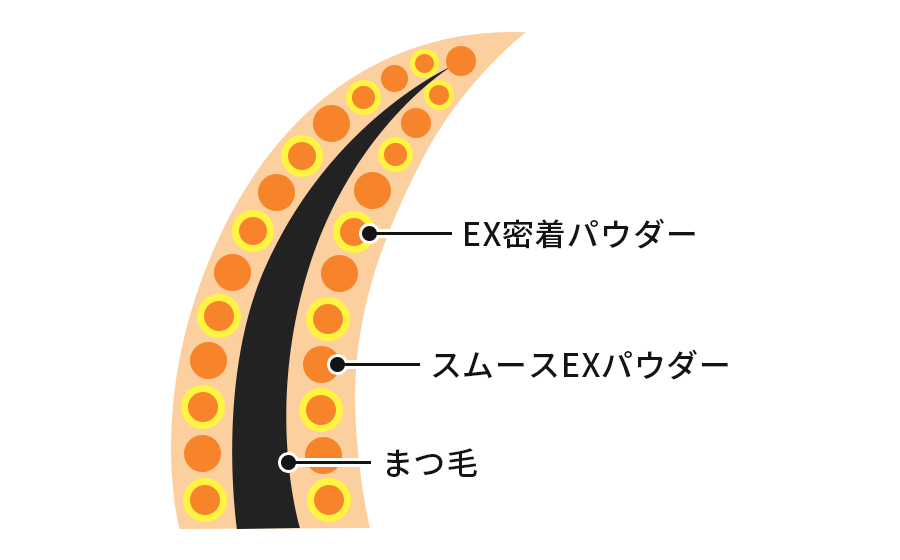 新開発“EX密着パウダー”と、すべりの良いい“スムースEXパウダー”を配合。従来と異なる2種のパウダーで、さらに自然で存在感のあるまつ毛に仕上げます。
